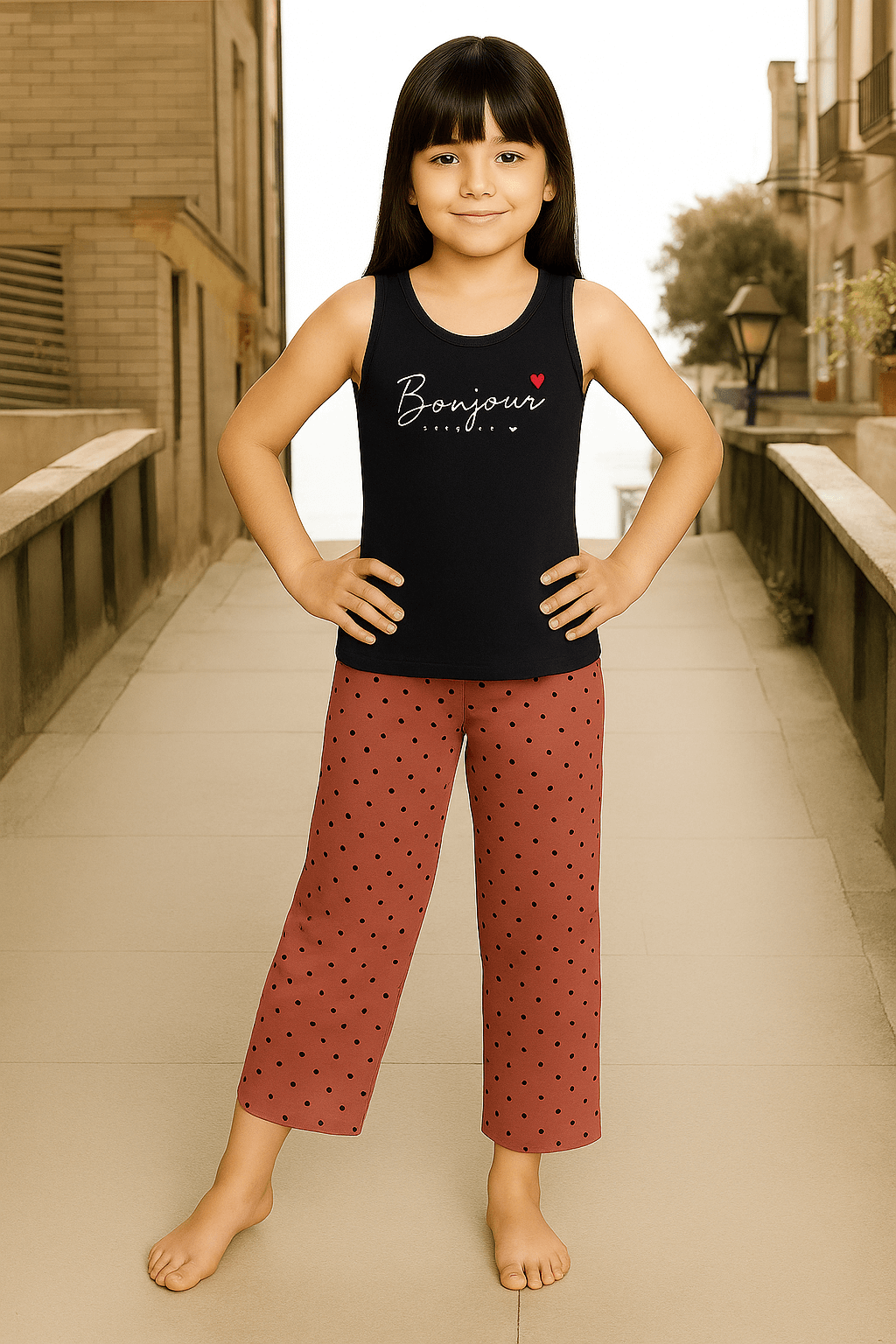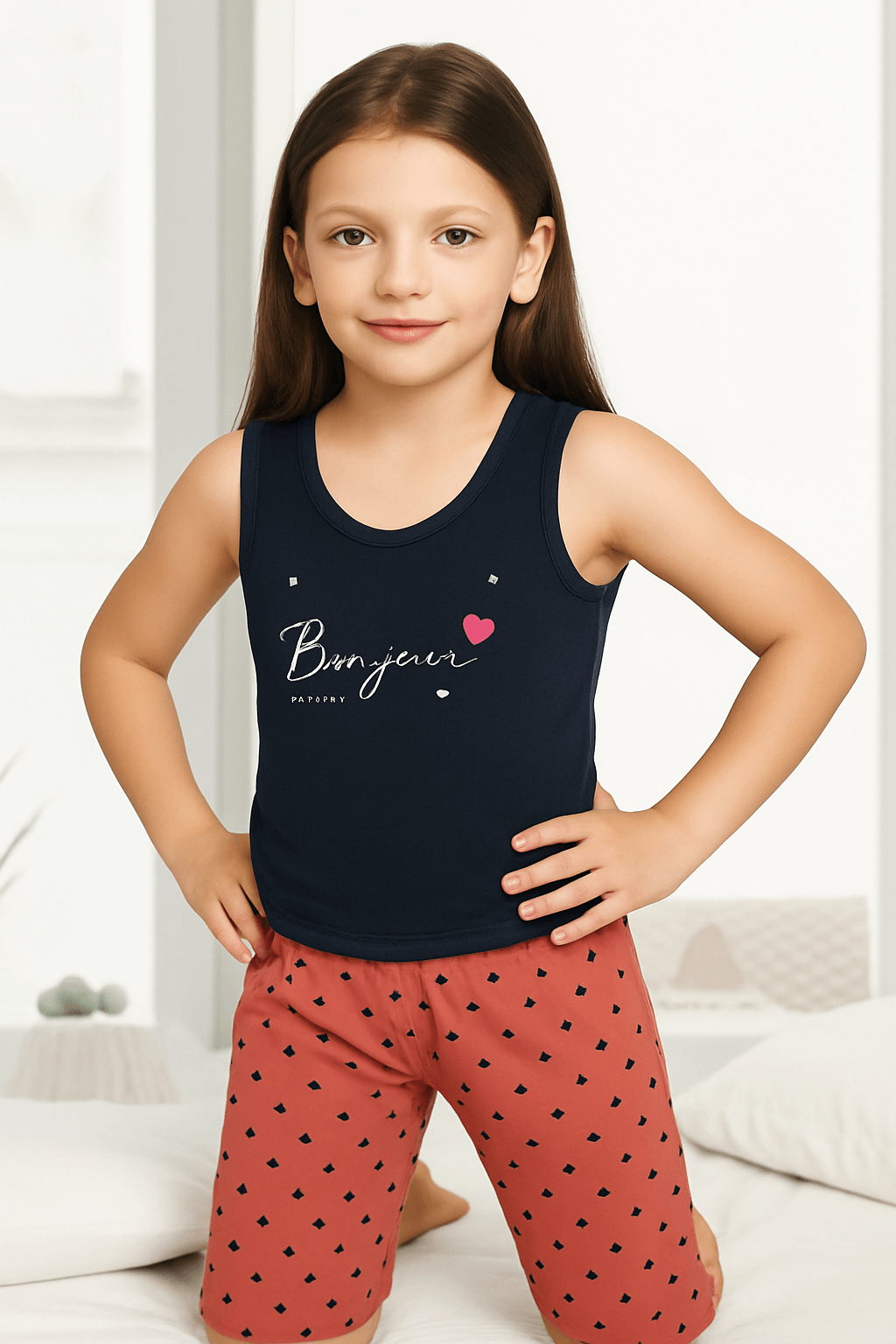 Keep your little one comfy and stylish with our 100% cotton pajamas. Featuring a soft navy sleeveless top with a playful “Bonjour” print and heart detail, paired with relaxed-fit coral pants patterned with navy accents.
