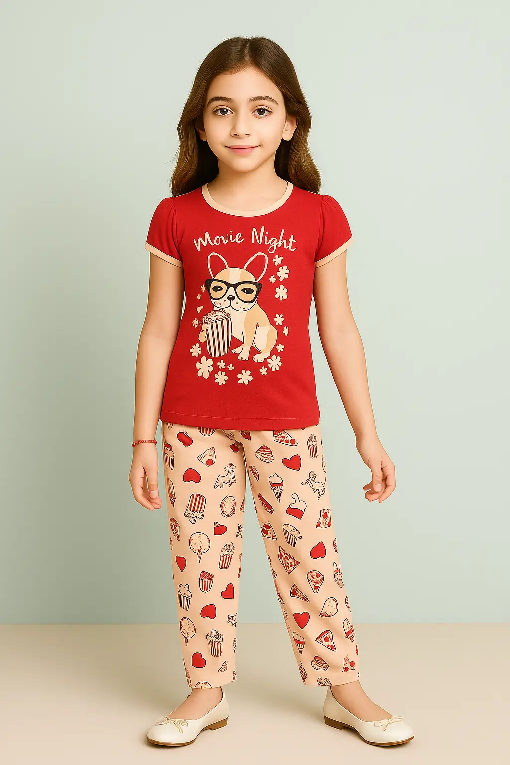 Make bedtime fun with this cozy 100% cotton pajama set! The bright red short-sleeve top features an adorable puppy graphic with popcorn and the slogan “Movie Night”. Paired with blush pink bottoms covered in playful prints of pizza, popcorn, hearts, and dogs – it’s perfect for little dreamers who love a cozy night in.